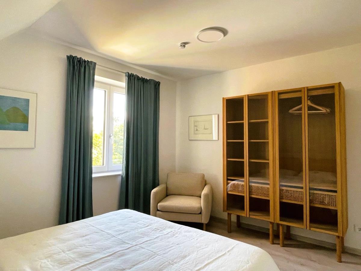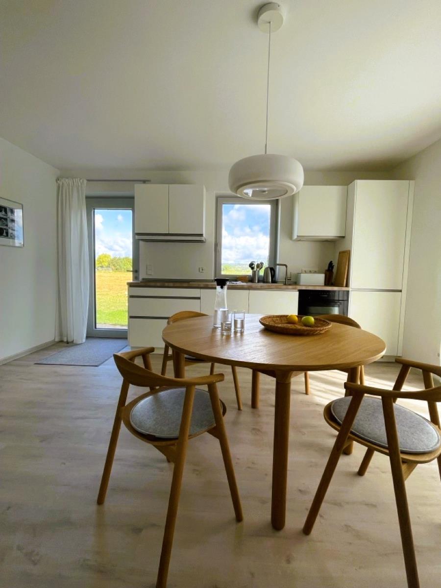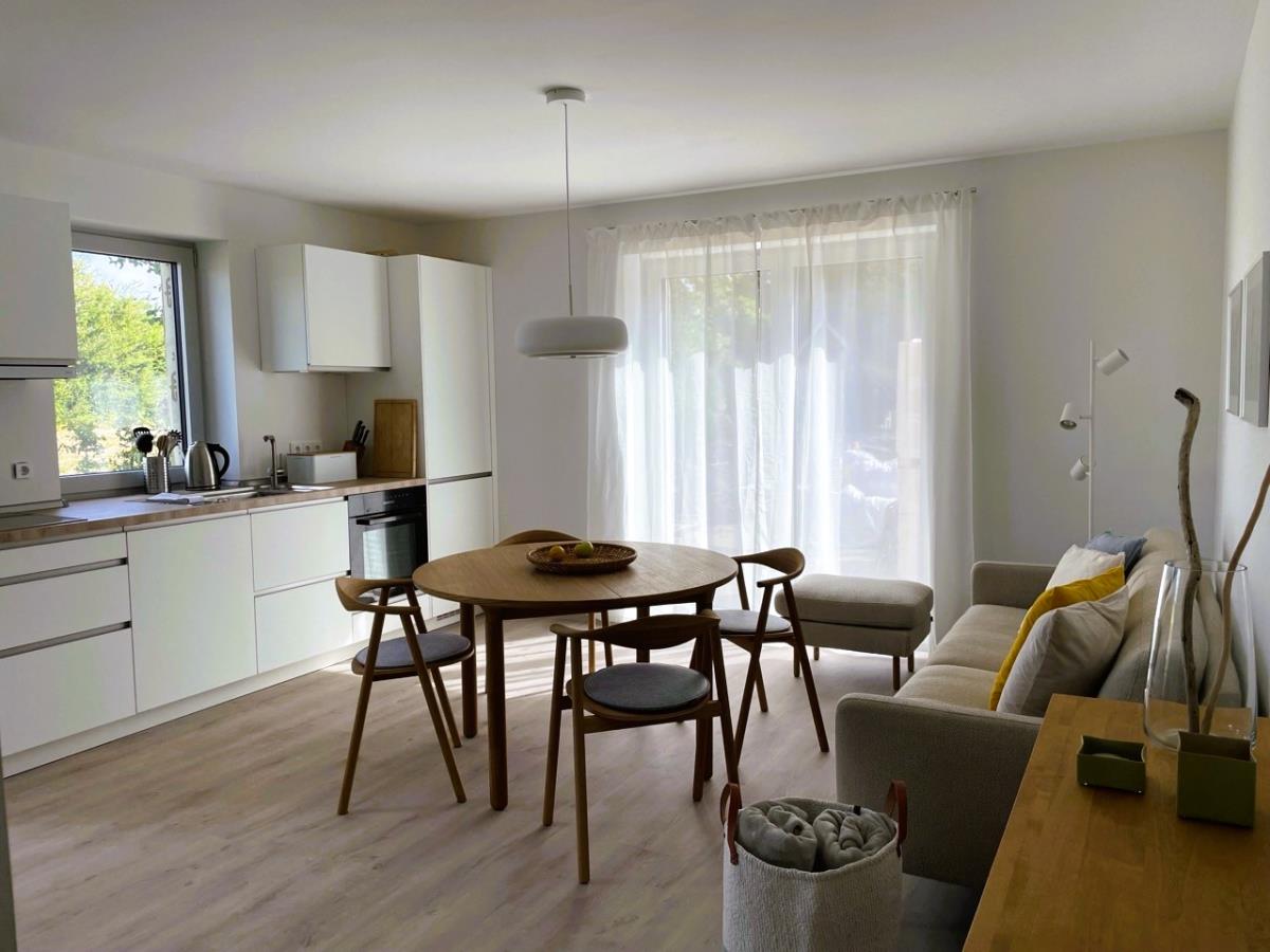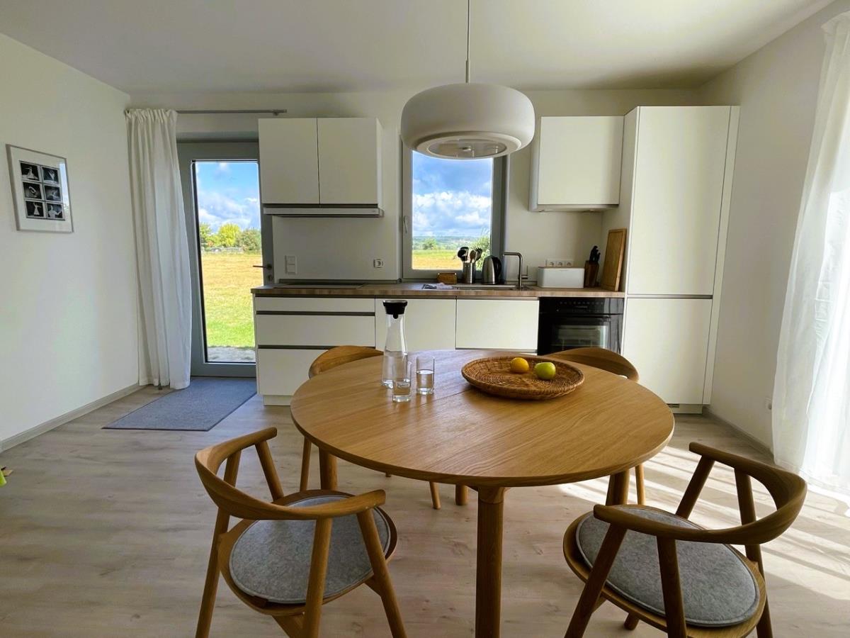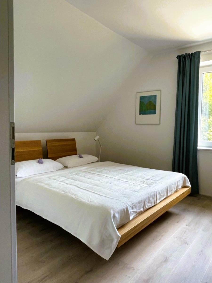 Die Wohnung "Nordost" (WE2) befindet sich im Erd- und Obergewschoss des Hauses. Sie ist etwa 50 qm groß und kann von bis zu 4 Gästen genutzt werden. Sie bietet ein Schlafzimmer Richtung Osten und ein Bad im OG, sowie ein kleines Zimmer Richtung Norden, das wahlweise als Home Office oder dank seines variablen Doppelstockbettes als zweiter Schlafraum genutzt werden kann, und ein Wohn- und Esszimmer mit Küche Richtung Nordosten im EG. Der Eingang zur Wohnung befindet sich an der Nordseite des Hauses und man hat über zwei Glastüren Zugang zum großzügigen Holzumlauf des Hauses und den Garten.