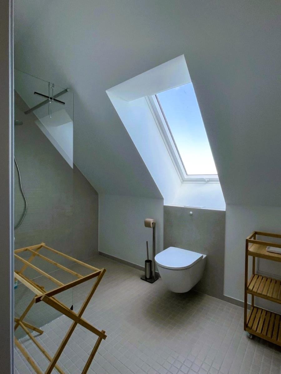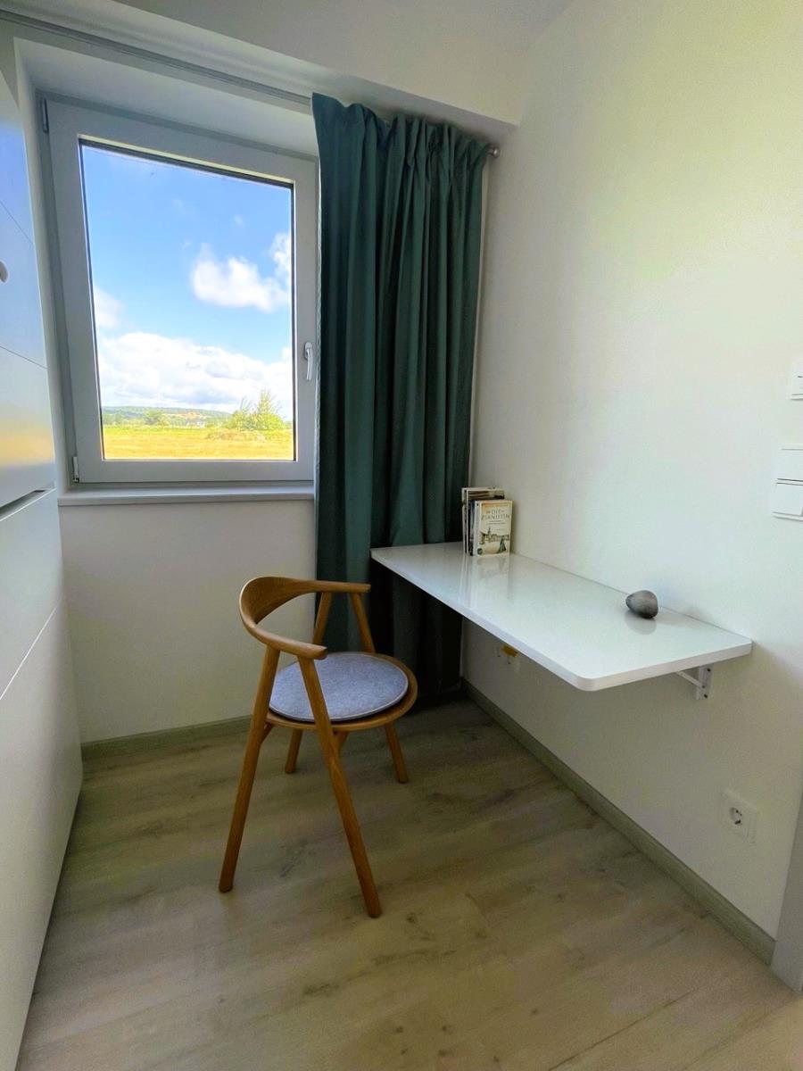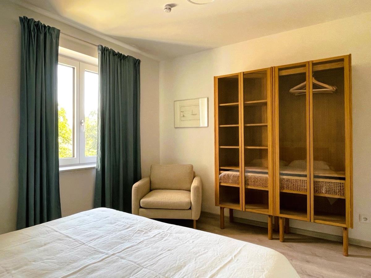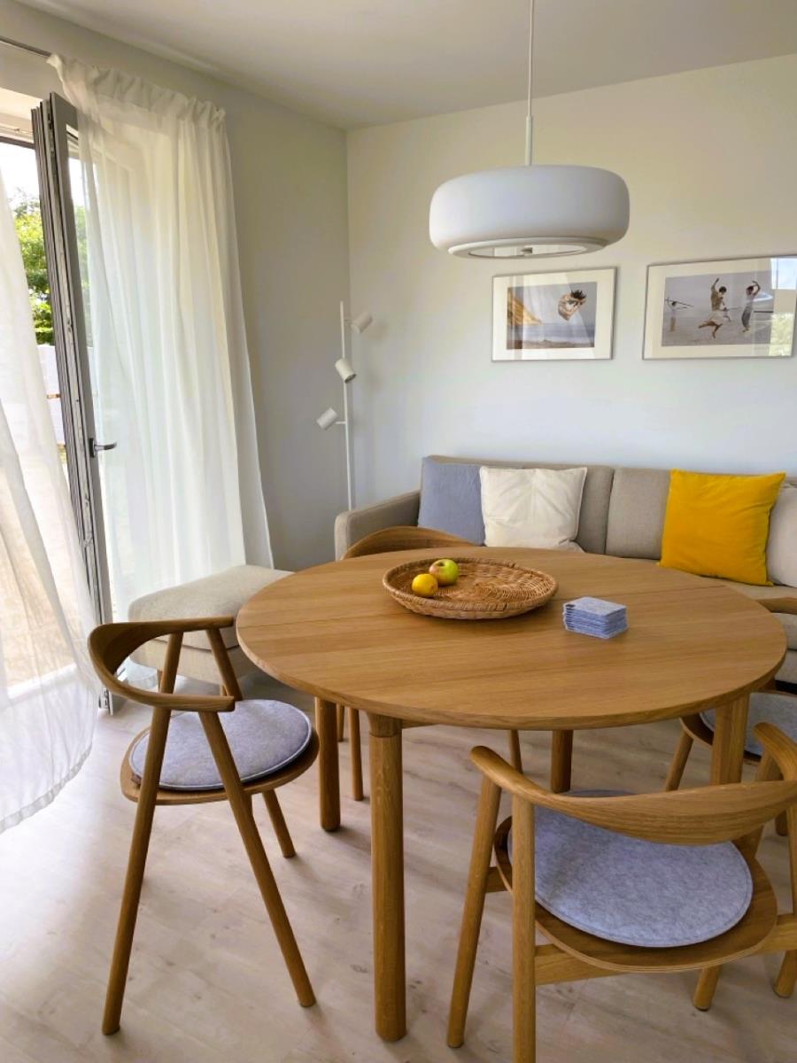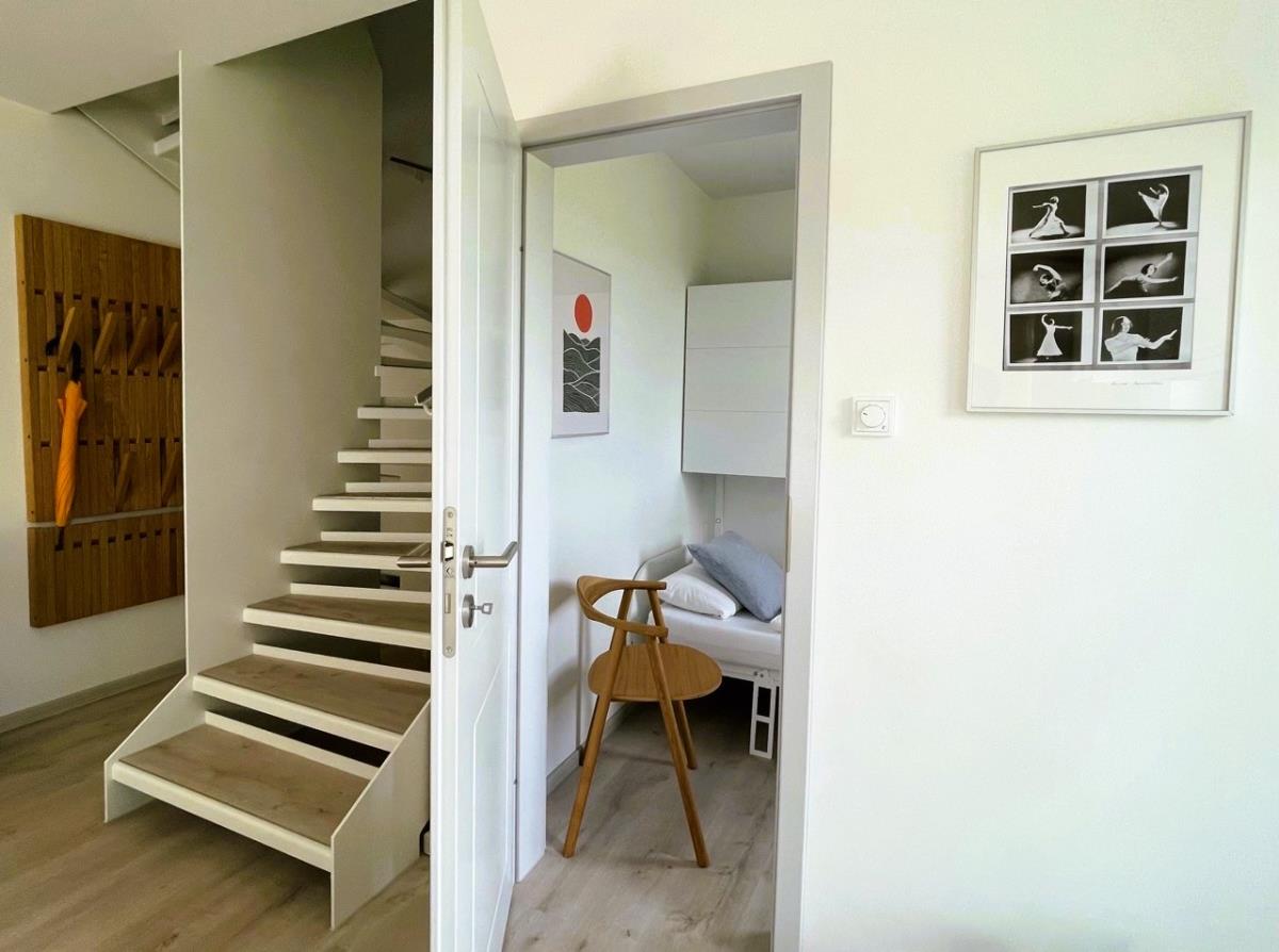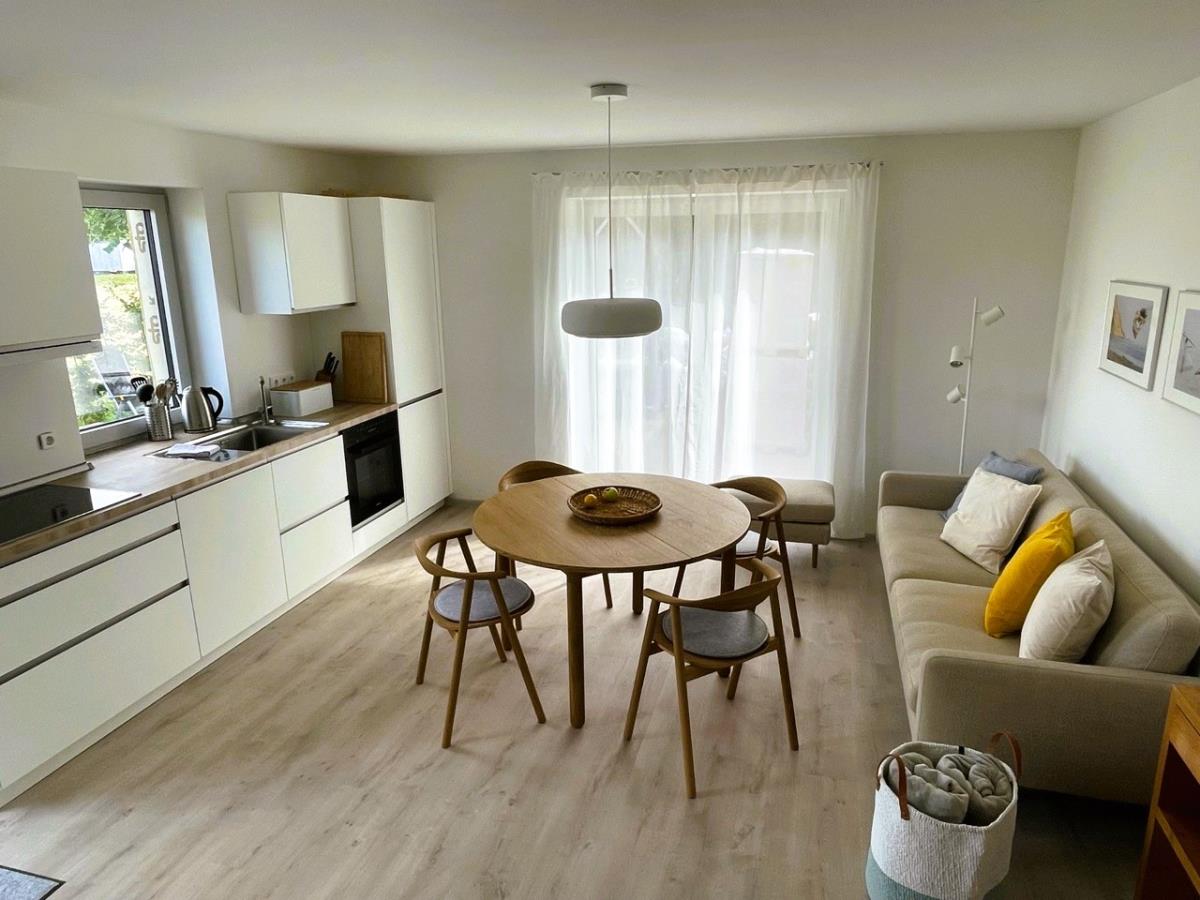Die Wohnung "Nordost" (WE2) befindet sich im Erd- und Obergewschoss des Hauses. Sie ist etwa 50 qm groß und kann von bis zu 4 Gästen genutzt werden. Sie bietet ein Schlafzimmer Richtung Osten und ein Bad im OG, sowie ein kleines Zimmer Richtung Norden, das wahlweise als Home Office oder dank seines variablen Doppelstockbettes als zweiter Schlafraum genutzt werden kann, und ein Wohn- und Esszimmer mit Küche Richtung Nordosten im EG. Der Eingang zur Wohnung befindet sich an der Nordseite des Hauses und man hat über zwei Glastüren Zugang zum großzügigen Holzumlauf des Hauses und den Garten.