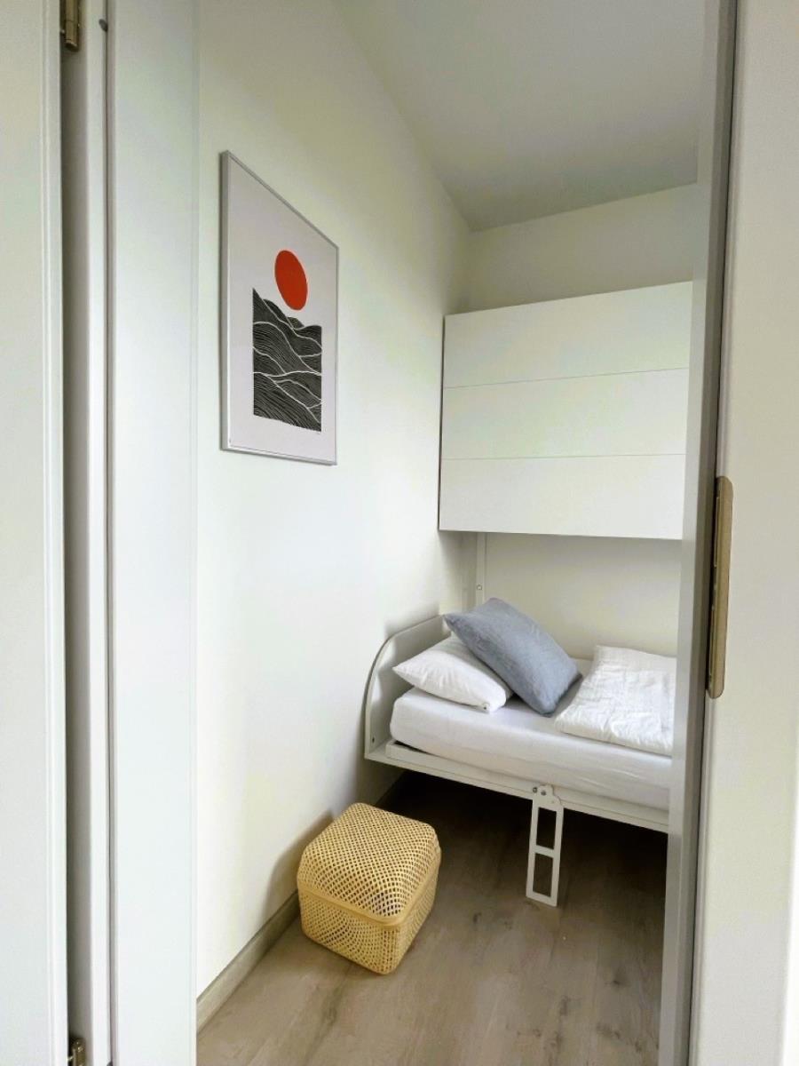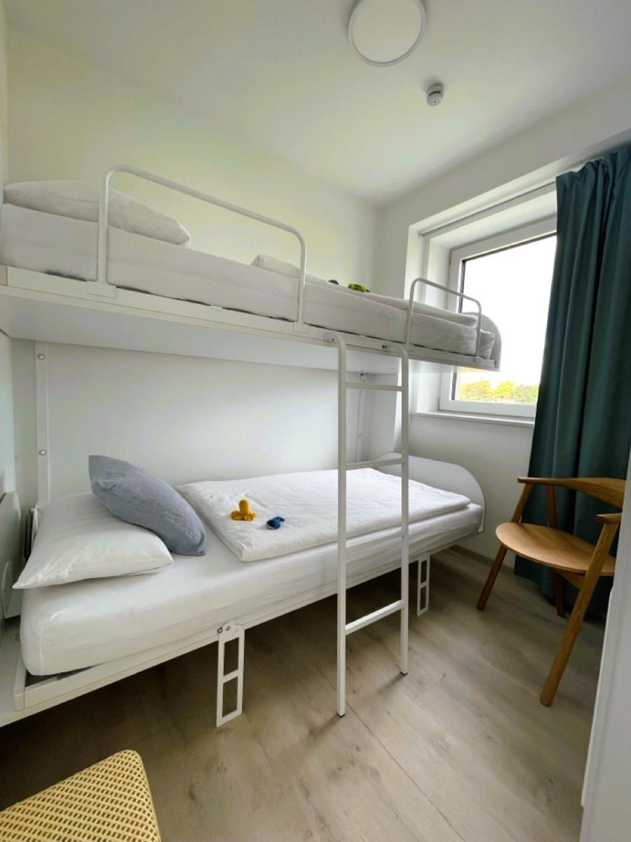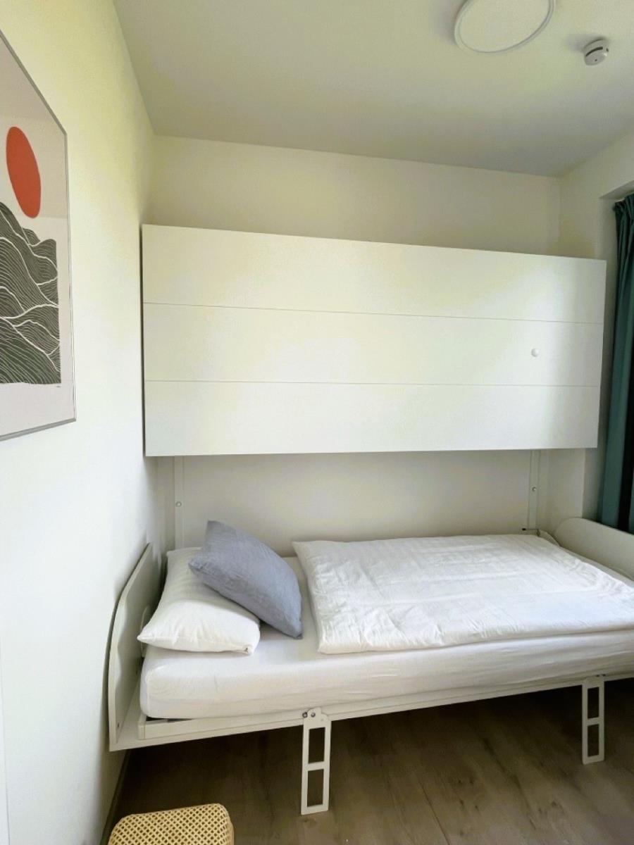 Hinweis zum Home Office bzw. zweiten Schlafraum: Bei hochgeklapptem Doppelstockbett und ausgeklapptem Schreibtisch kann dieser Raum als grozügiges Home Office genutzt werden. Alternativ kann man den Raum bei hochgeklapptem Schreibtisch und ausgeklapptem Doppelstockbett als kleinen zweiten Schlafraum nutzen. Das Doppelstockbett kann variabel als drittes oder drittes und viertes Bett genutzt und dementsprechend auf einer oder zwei Ebenen ausgeklappt werden. Beide Betten sind jeweils 90 x 200 cm groß und mit hochwertigen Naturlatexmatratzen ausgestattet.